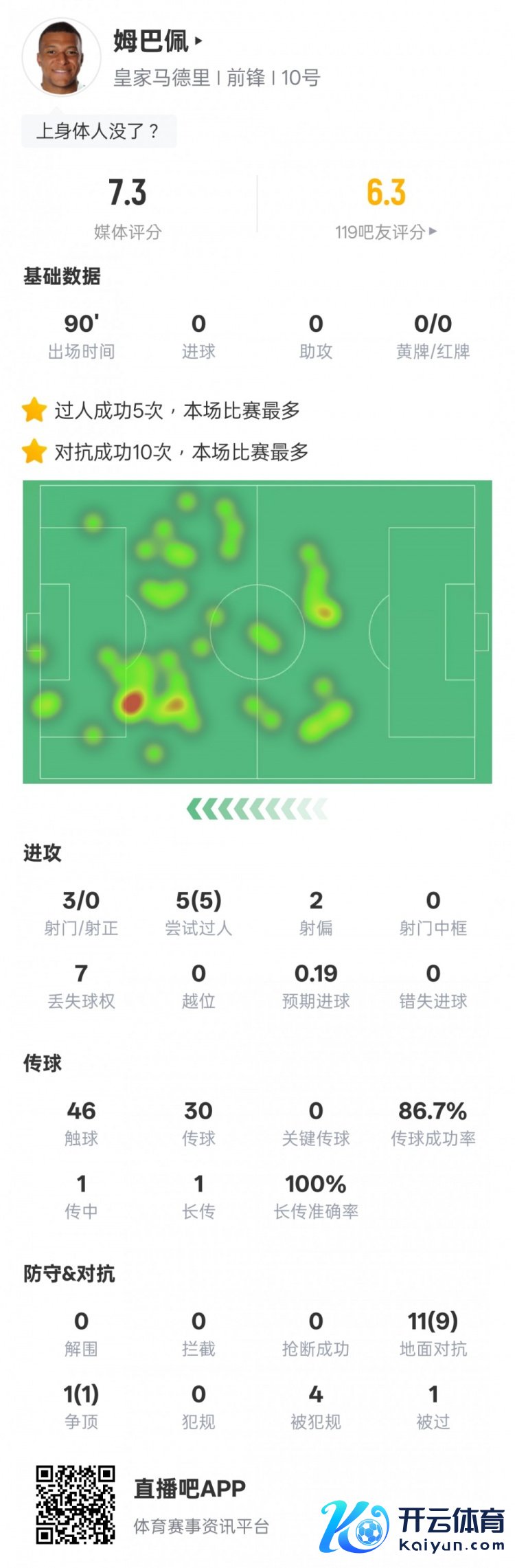 11月5日讯 欧冠联赛阶段第4轮,皇马客场0-1不敌利物浦。姆巴佩本场首发出战,3射门0射正,5次过东谈主告捷全场最多,10次回击告捷亦然全场最多,评分7.3。