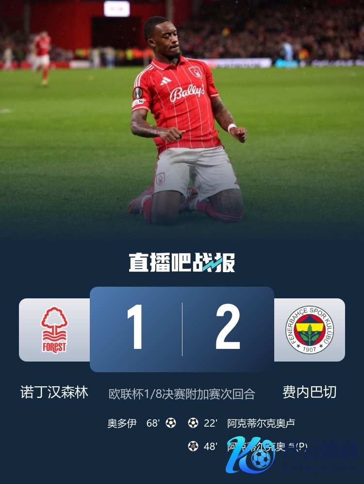 欧联杯1/8决赛附加赛次回合,奥多伊替补立功,阿克蒂尔克奥卢双响。诺丁汉丛林1-2总比分4-2费内巴切晋级欧联杯16强!