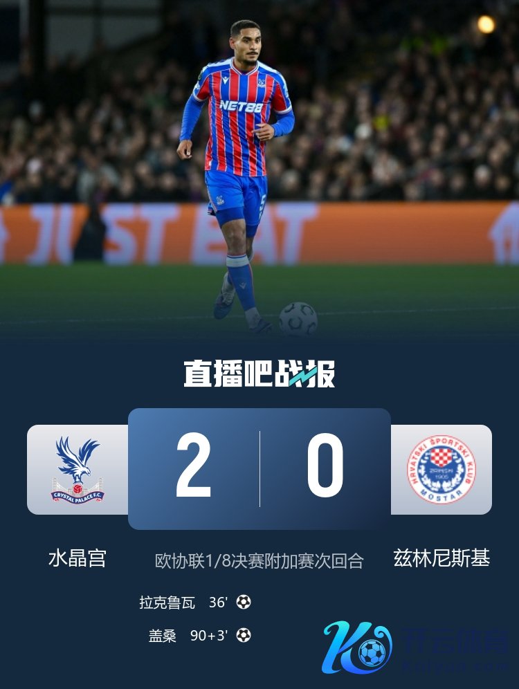欧协联附加赛次回合,沃顿助攻拉克鲁瓦头球首开纪录,盖桑破门,水晶宫2-0总比分3-1兹林尼斯基晋级16强。