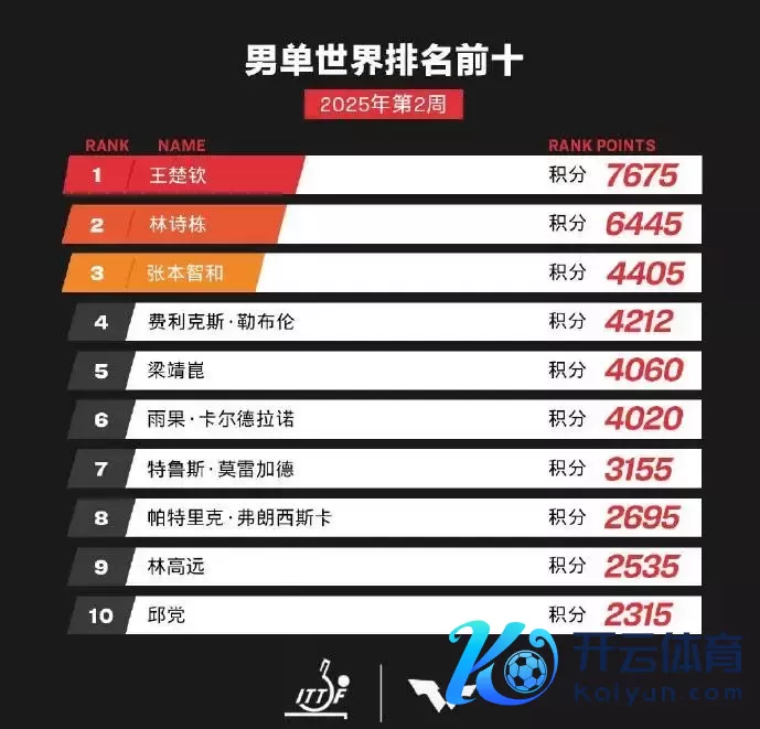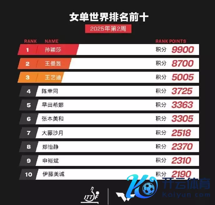 当天,WTT公布了2025年第2周寰宇排名,孙颖莎、王楚钦握续领跑男女单打排行榜。