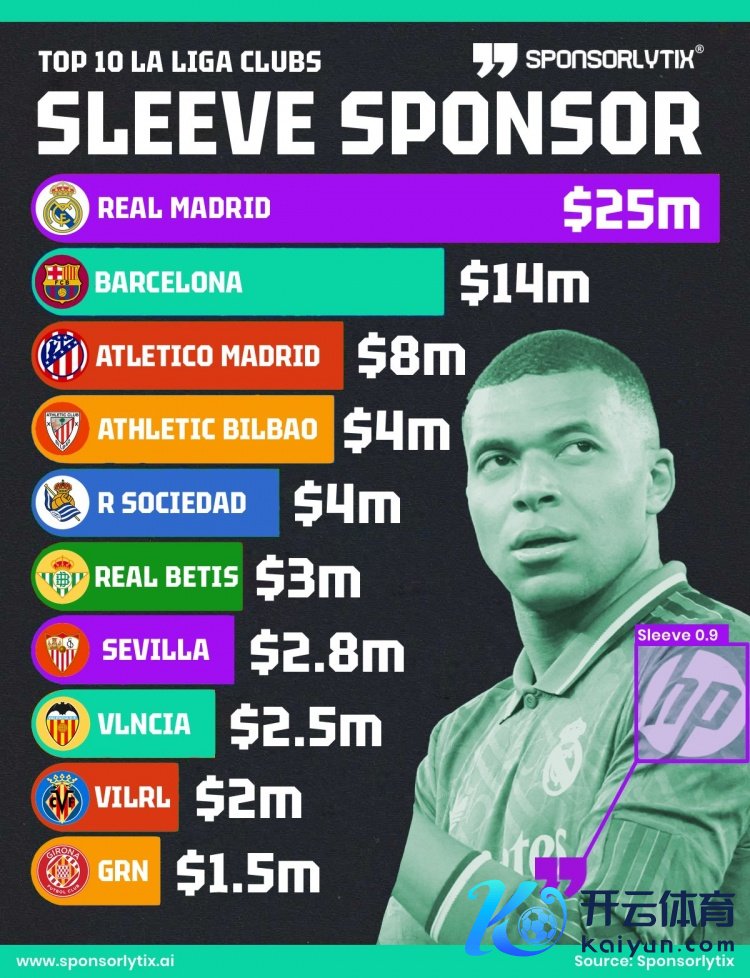 10月8日讯 Sponsorlytix统计了西甲各队每年的衣袖告白收入,并排出榜单,皇马2500万好意思元居首,巴萨1400万好意思元次席。