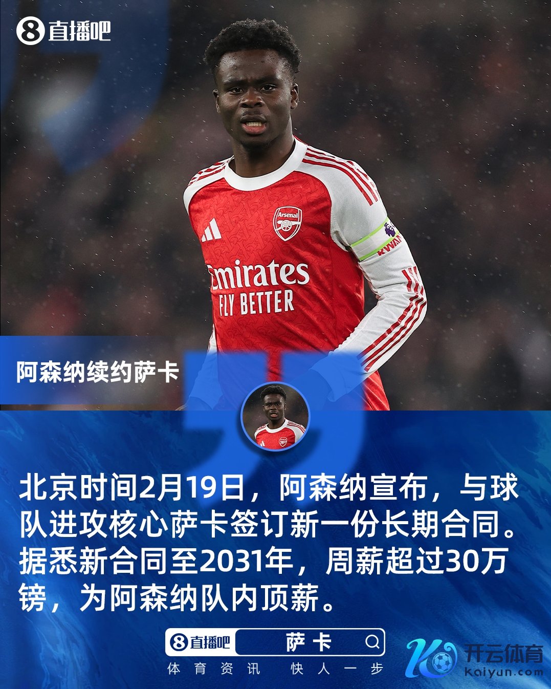 在上个月,阿森纳刚刚与萨卡续约至2031年,据媒体报谈,萨卡的新契约周薪逾越30万镑,是队内的顶薪。