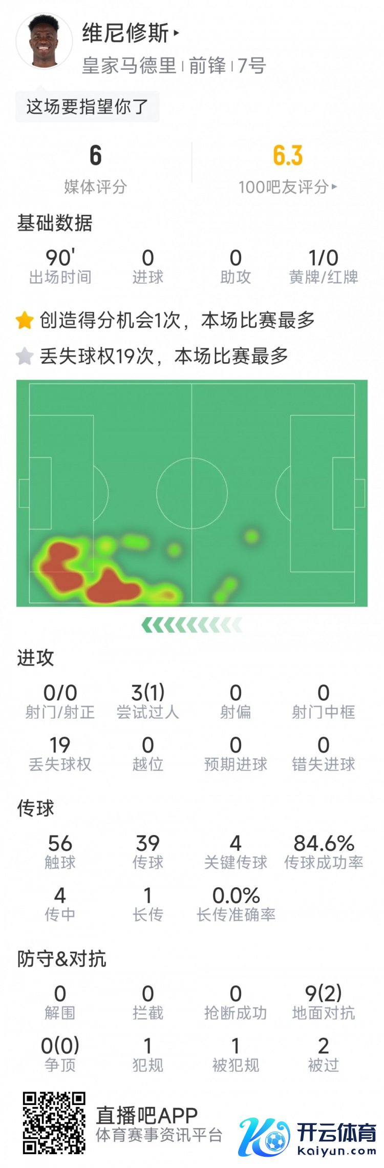 11月5日讯 早蓝本欧冠,利物浦1-0皇马,以下为维尼修斯本场数据: