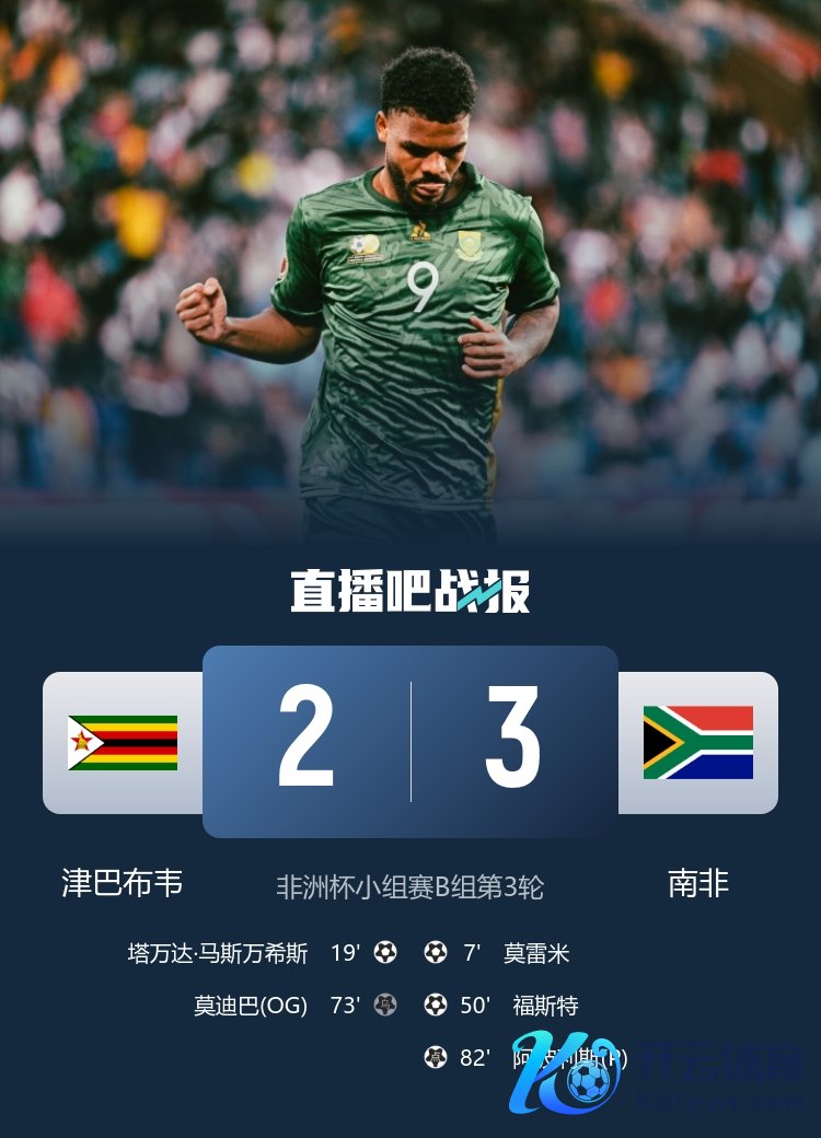 非洲杯小组赛B组第3轮,南非3-2降服津巴布韦,以第二名晋级,阿波利斯点射制胜。