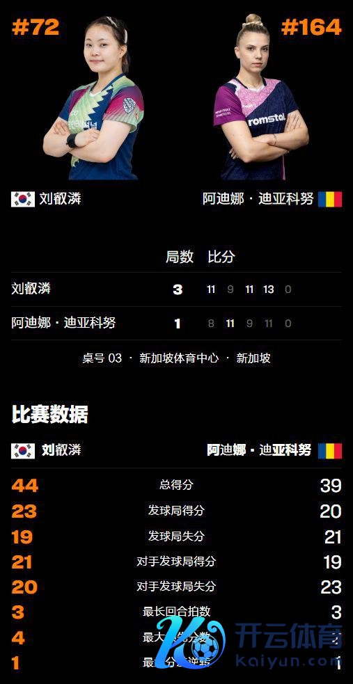 2026 年 2 月 21 日,乒乓球 WTT 新加坡大满贯迎来阅历赛第三轮的较量,韩国但愿之星、奥运冠军刘南奎之女刘叡潾登场,对决罗马尼亚畅通员迪亚克努,效果此前 3-1 胜皮科林(意大利)、3-1 胜张璇(西班牙)的刘叡潾再次以 3-1 取胜,固然一度错失 4 个赛点但莫得崩盘,由此而收效锁定女单正赛的门票,详备战况请看下文。
